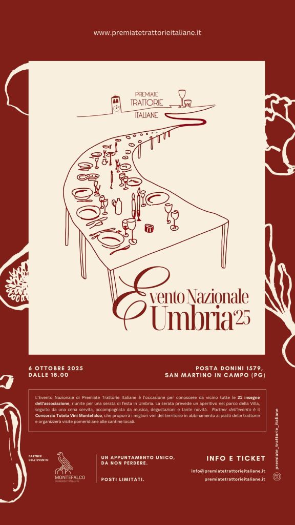 Posted on October 4, 2025October 4, 2025 by caffelacrepaTutti a Perugia: a cena con le PREMIATE TRATTORIE ITALIANE! Lunedi 6 Ottobre 2025 il Caffè La Crepa prenderà parte all’evento nazionale delle Premiate Trattorie Italiane che si svolgerà a Perugia. IL CAFFE’ LA CREPA rimarrà CHIUSO PER FERIE da Lunedì 6 a Giovedì 9 Ottobre 2025. La riapertura è prevista VENERDI 10 per il servizio del pranzo Share this: Click to share on X (Opens in new window) X Click to share on Facebook (Opens in new window) Facebook Like Loading... Correlati